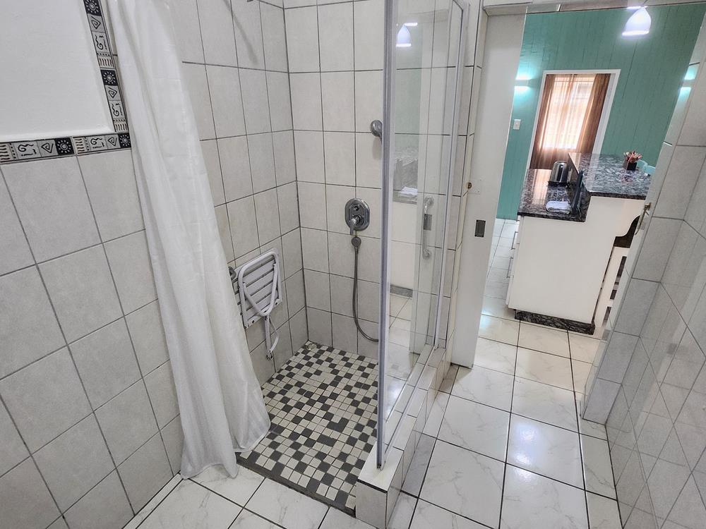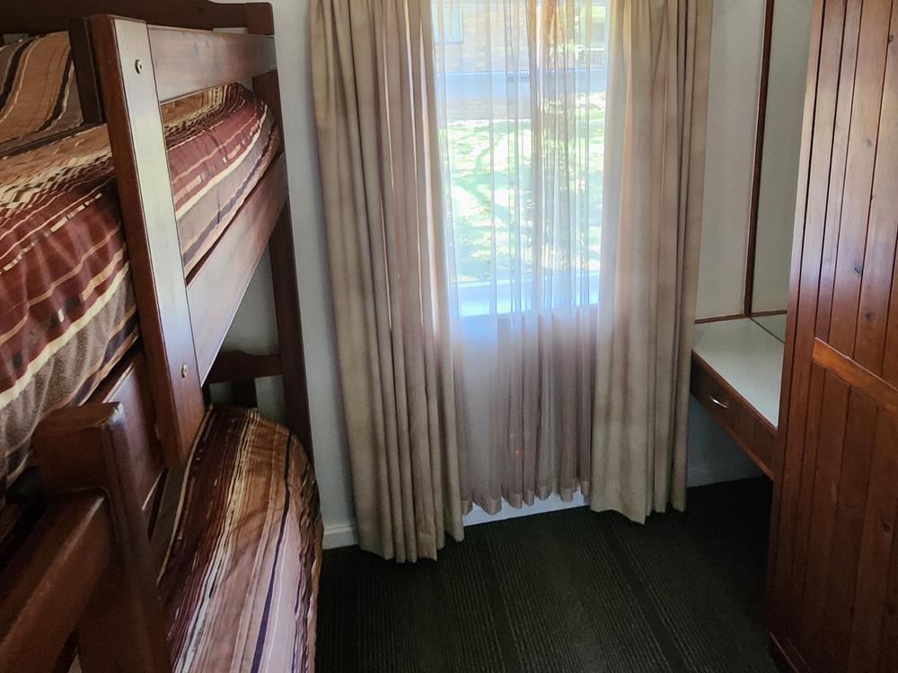 Three Bedroom Chalet. Main Bedroom with single beds. Second and third Bedrooms have one bunk bed in each Bedroom. Open plan Living-room and kitchen: stove, fridge, microwave, DSTV (selection of channels). Bathroom with wheelchair accessible shower and toilet (no bath). Patio area with braai. Open parking. Maximum 6 Persons.